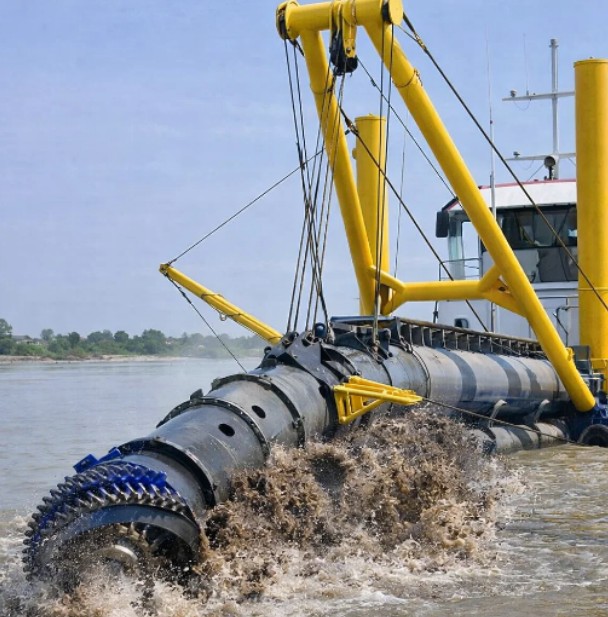 At the start of operation, the bridge at the bow of the cutter suction dredger is lowered. The rotating cutter head at the end of the bridge rotates at high speed, driven by hydraulics or electricity. The carbide teeth on the cutter head, like giant teeth, cut and break up hard clay, gravel, and even hard rock.