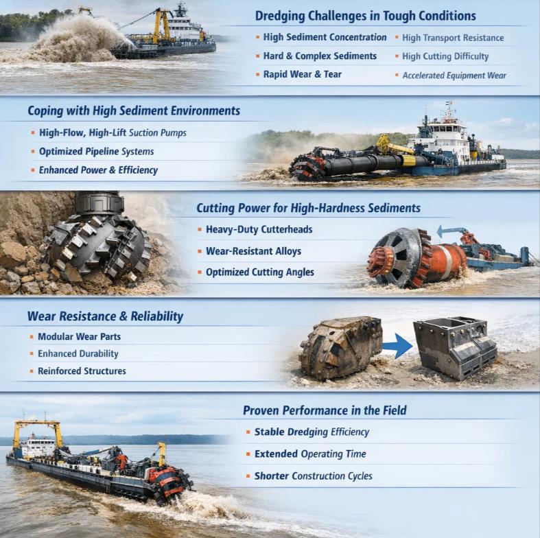 In river dredging, port and waterway improvement, and large-scale water conservancy projects, high sediment content and high-hardness bottom sediments have always been considered among the most challenging construction conditions. In such environments, the stability of dredging efficiency and the reliability of equipment directly affect project progress and construction costs.