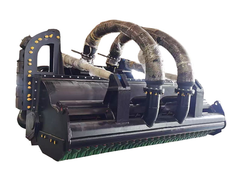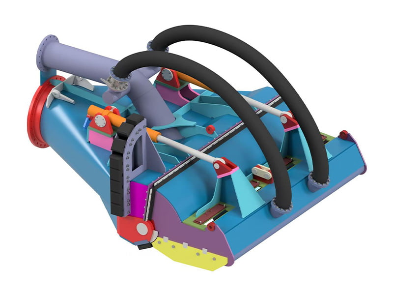 To cut the seabed, the dredge draghead is equipped with replaceable teeth and water jet nozzles. The nozzles are placed at the front of the dredge draghead and used to cut the sand at the sea bed vertically, while the replaceable teeth are placed at the back to cut horizontally.